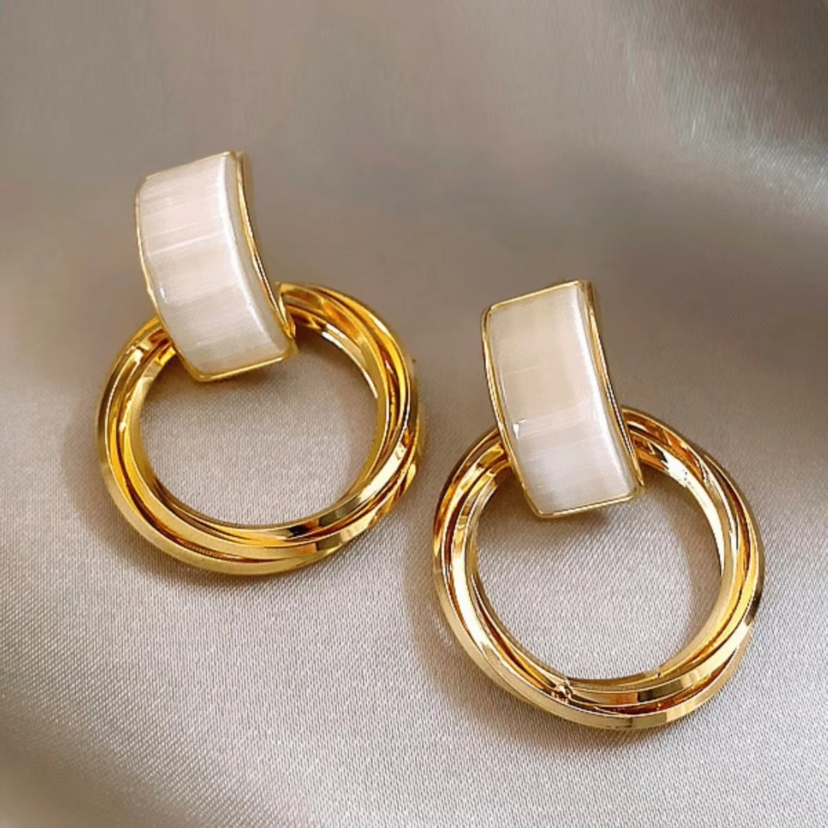 Add a touch of elegance and charm to your look with these Gold-Plated Hoop Drop Earrings. Designed with a unique blend of modern artistry and classic style, these earrings feature a double-ring gold hoop paired with a glossy pearl-white enamel top, creating a luxurious and eye-catching contrast.