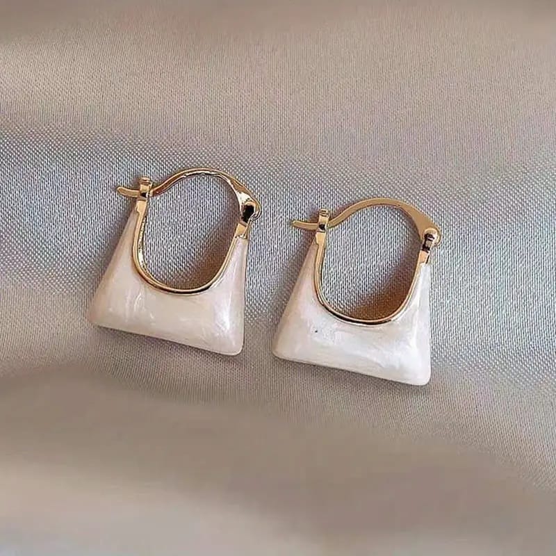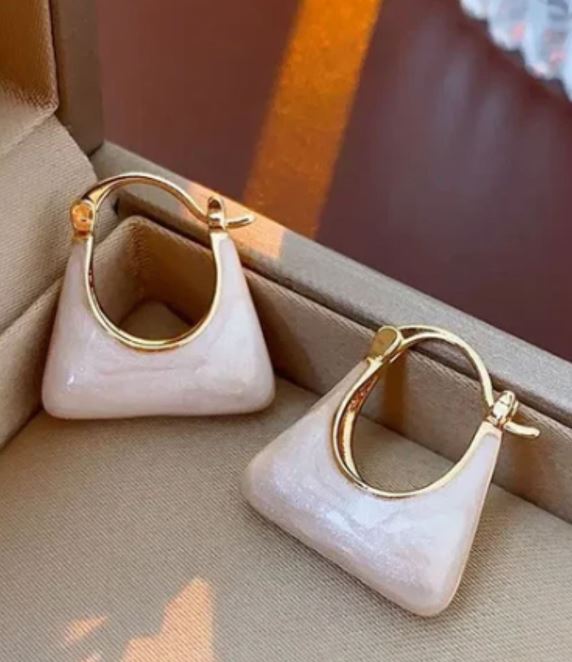 Introducing the Bag Shape Hoops—a bold yet refined statement piece designed for the modern muse. These earrings feature a distinctive triangular silhouette, crafted with a smooth blush-toned resin that softly catches the light. The high-shine finish is complemented by elegant gold hardware, creating a beautiful fusion of minimalism and glam.