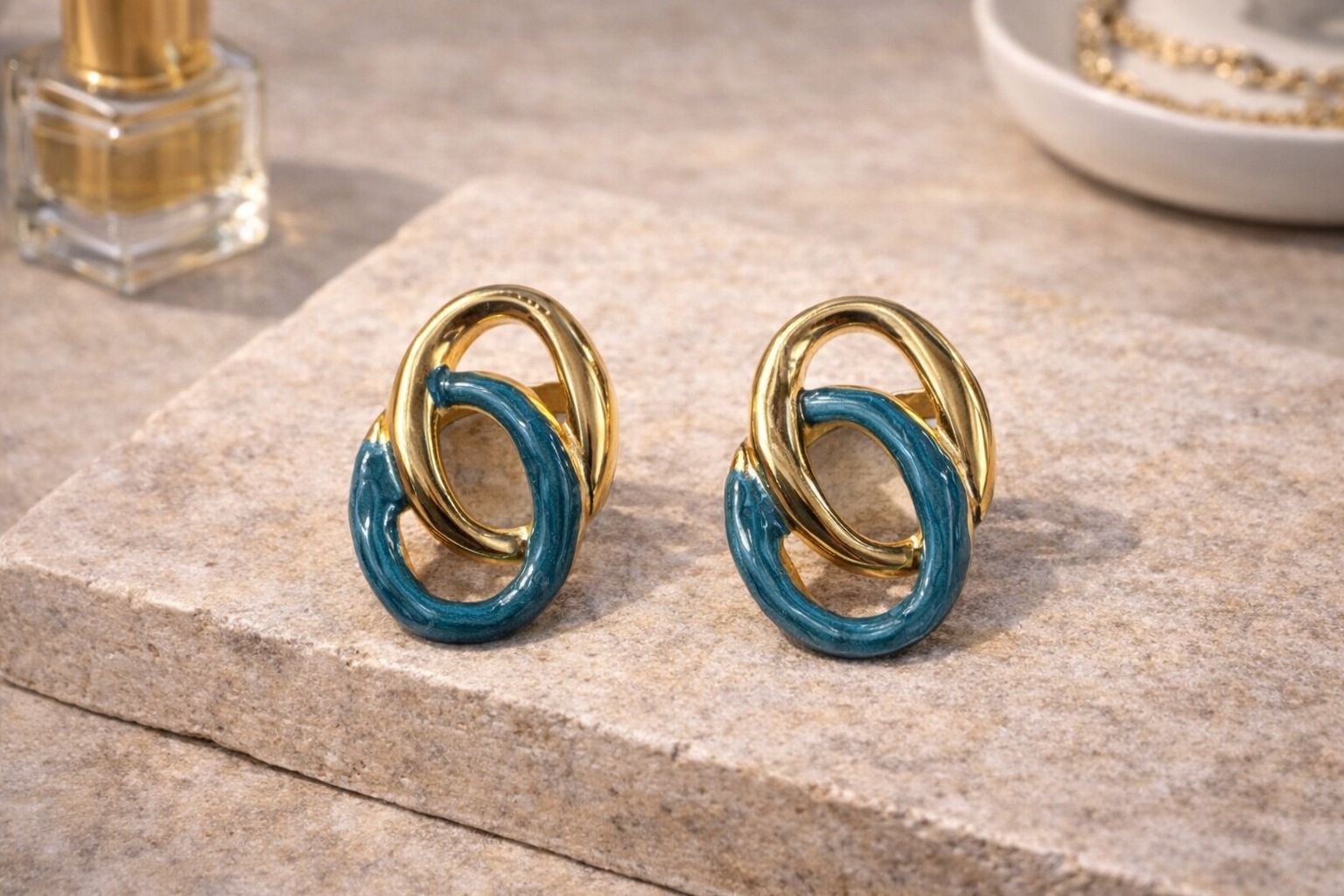 Stylish dual-loop earrings with gold and teal enamel detailing—perfect for a bold and modern statement look.