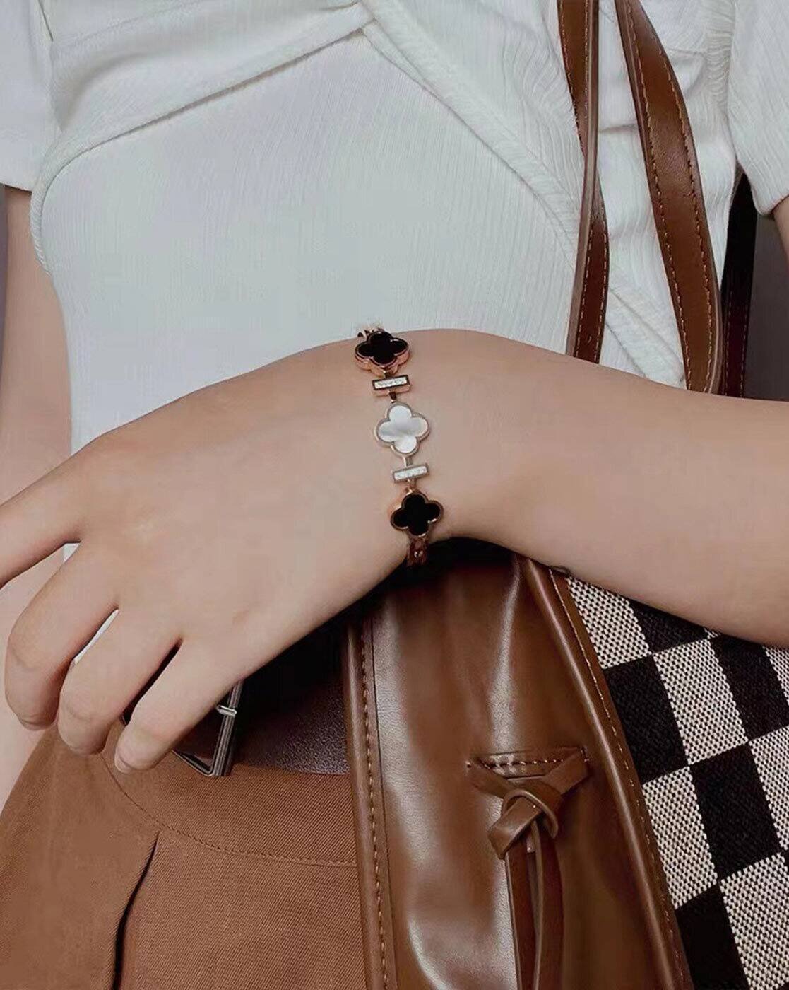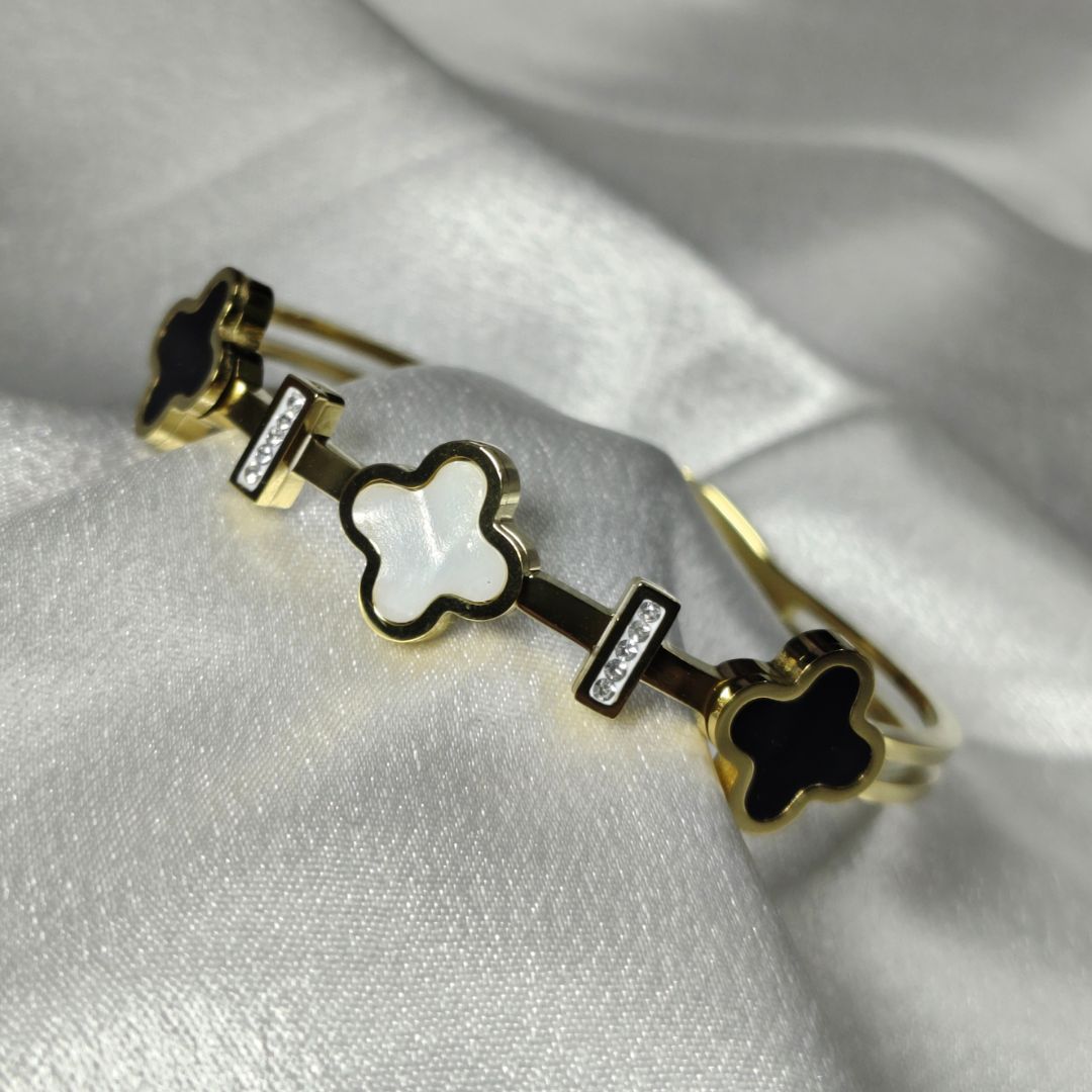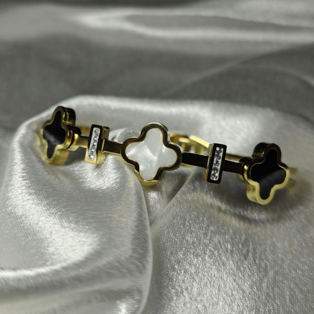 Elevate your everyday style with this sophisticated clover bracelet, designed to blend minimal elegance with modern luxury. Featuring a sleek gold-toned structure, this piece is adorned with alternating black and ivory clover motifs that create a stunning contrast.