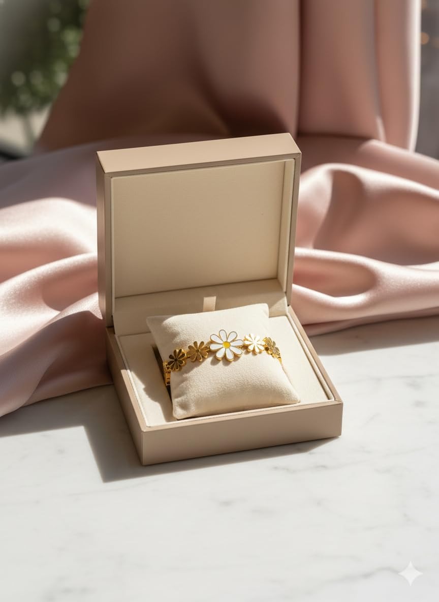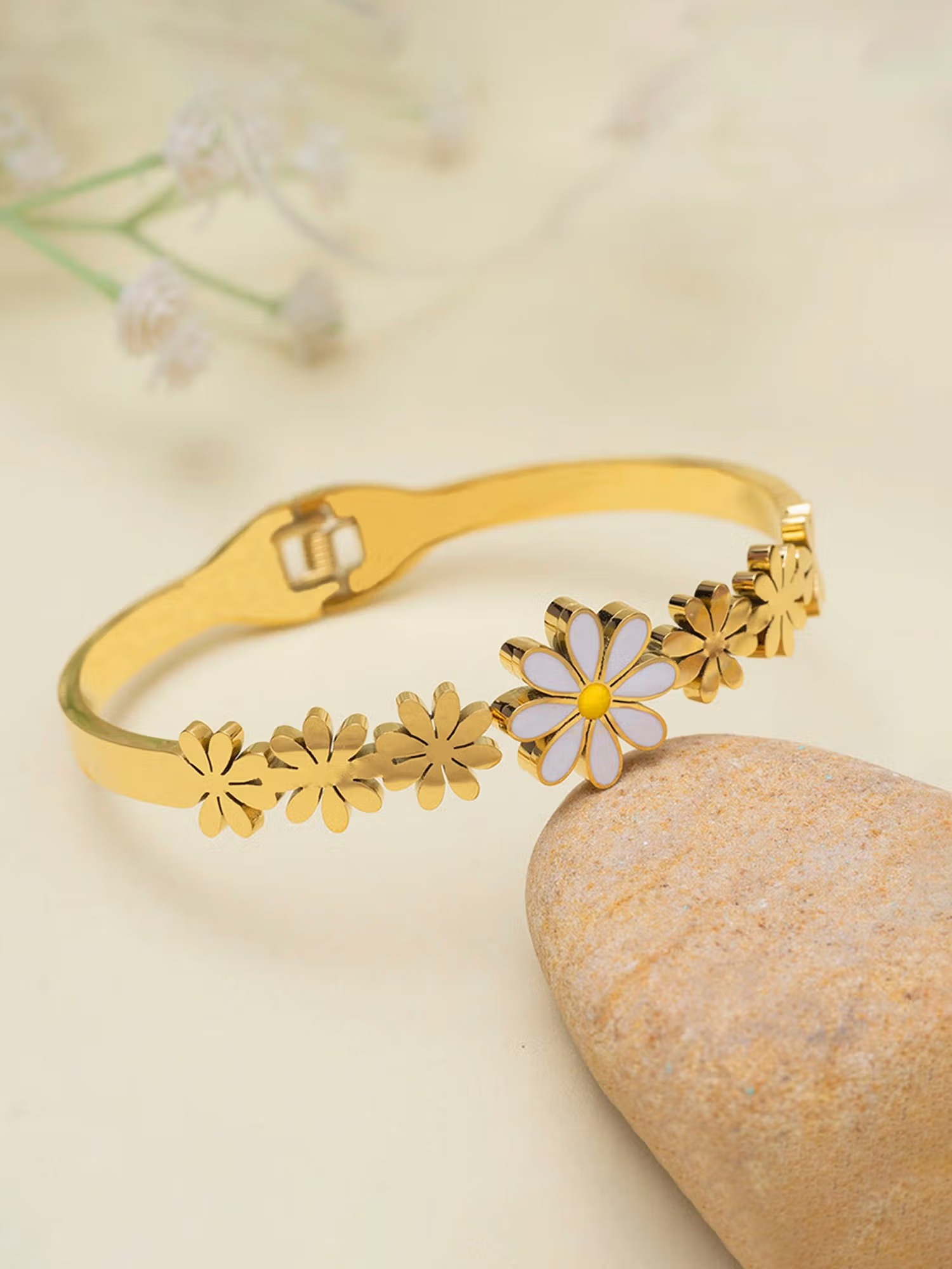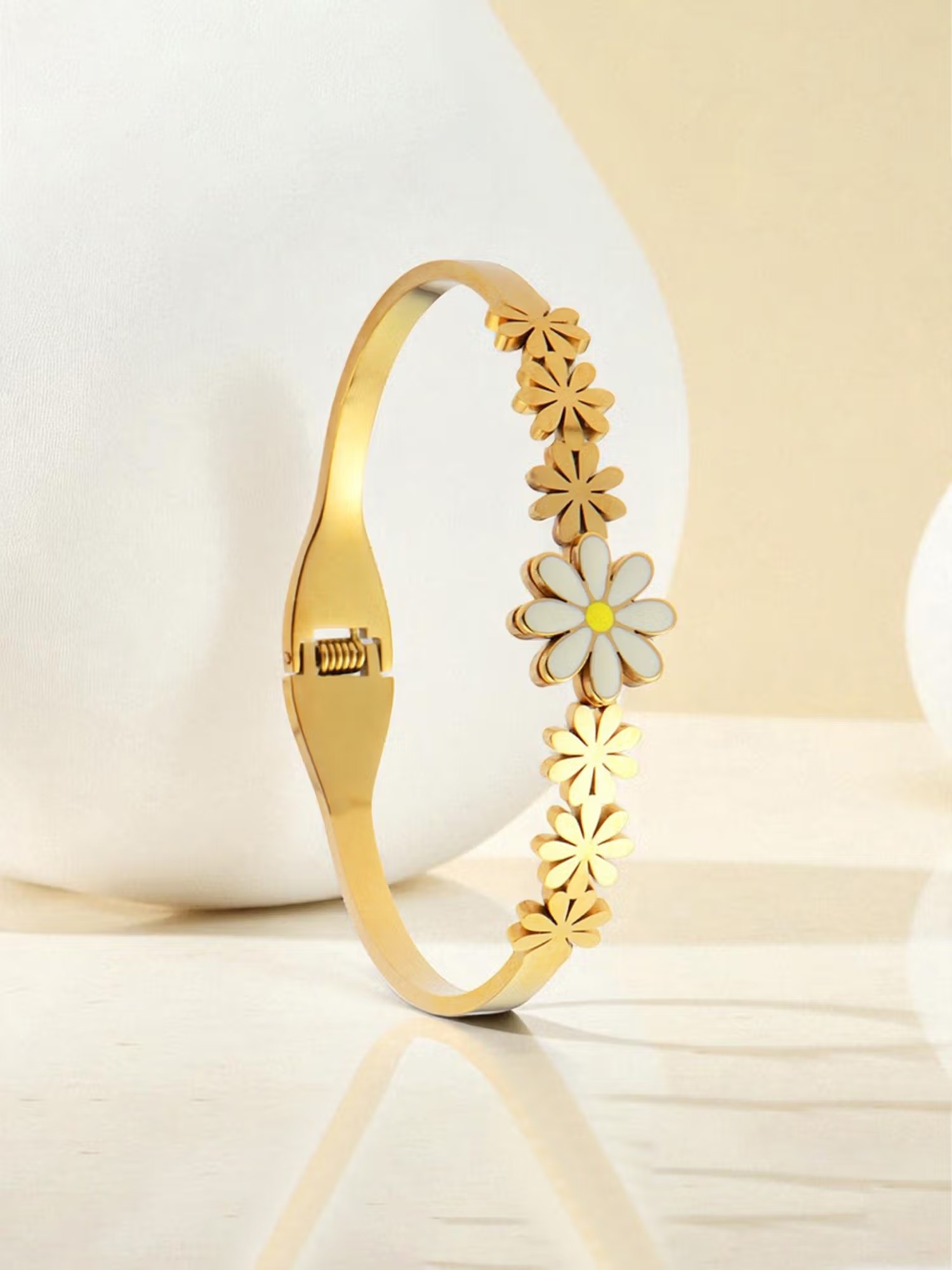 Elegant floral bracelet featuring a daisy-inspired design with a glossy enamel finish and gold-toned detailing—perfect for adding a subtle yet stylish charm to any outfit.