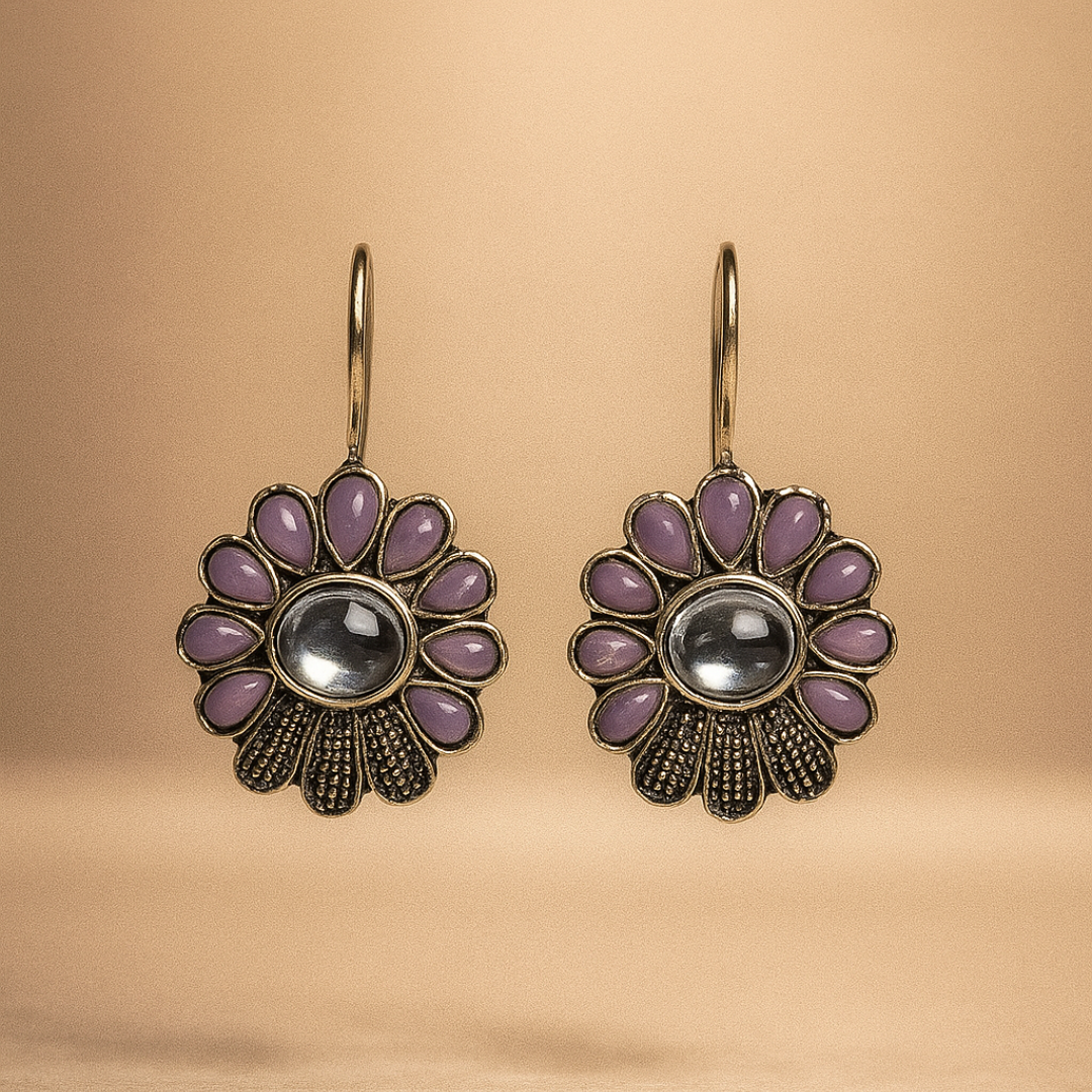 Crafted in an antique gold finish, the oxidized lower petals add texture and depth to the design, making them a perfect fusion of vintage and contemporary aesthetics. Their lightweight hook design ensures all-day comfort, while the vibrant colors make them a standout accessory for festive gatherings, weddings, or even everyday ethnic wear.