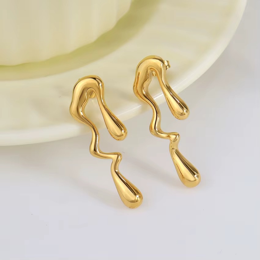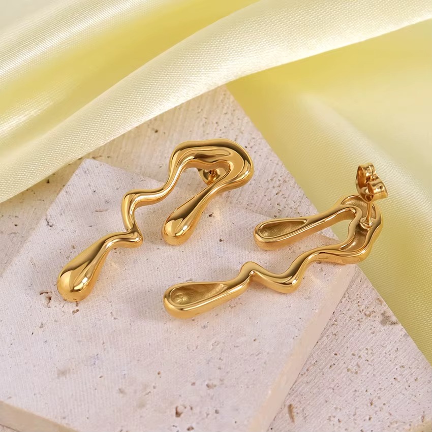 These Golden Abstract Drop Earrings are a perfect blend of modern art and timeless elegance. Designed with a fluid, sculptural shape, they stand out with their unique, free-flowing form that adds a bold statement to your look. The high-polish gold finish reflects light beautifully, giving them a luxurious and eye-catching appeal.