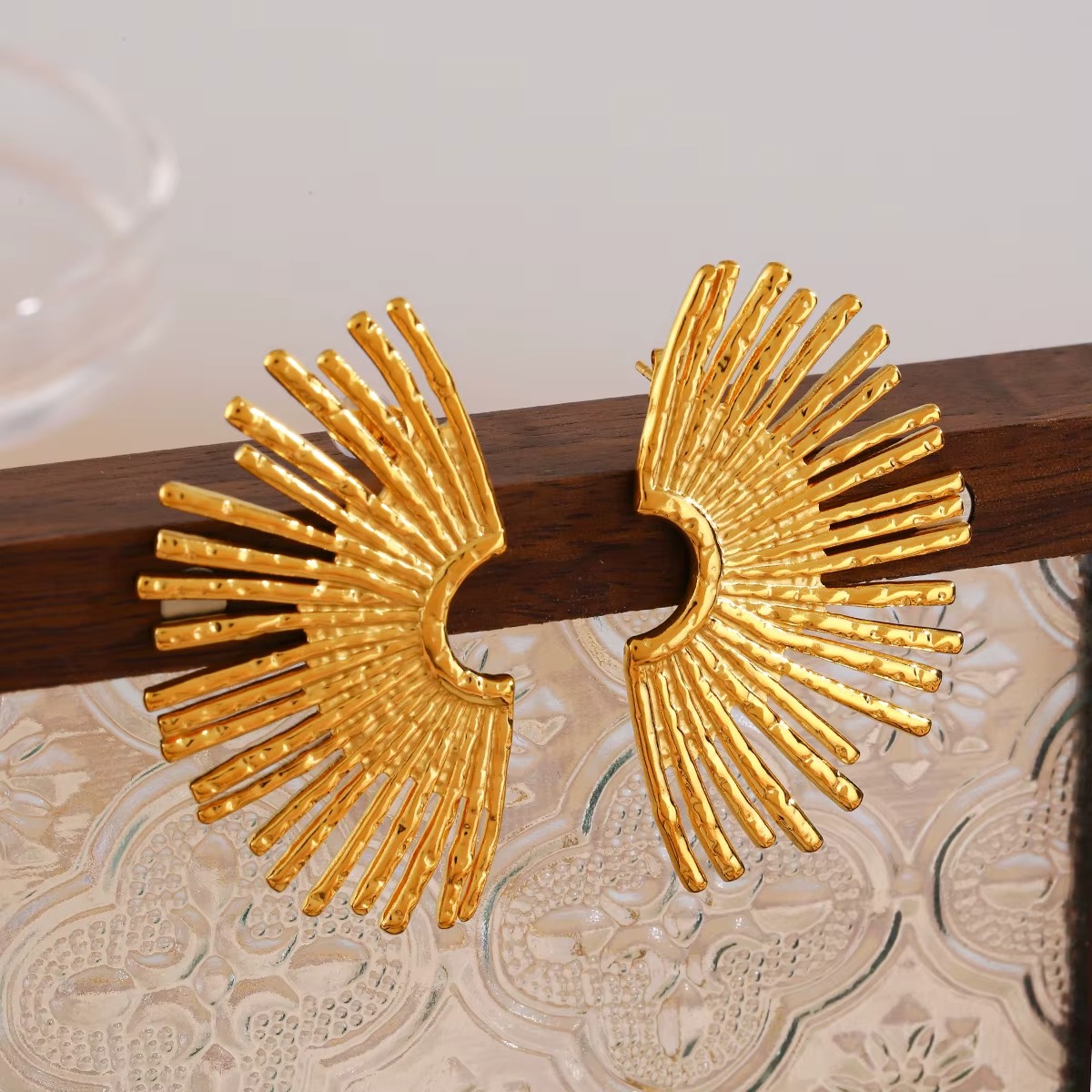 • Bold fan-shaped earrings with radiant sunburst design