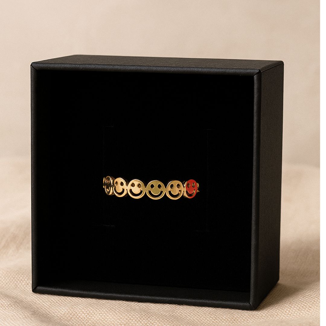 Add a dash of happiness to your style with the Smiley Mood Ring – a playful accessory that radiates positivity. Featuring a series of golden smiley faces with one standout red enamel smile, this ring celebrates individuality and the little joys in life.